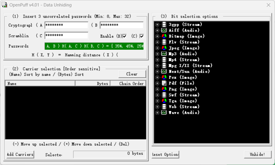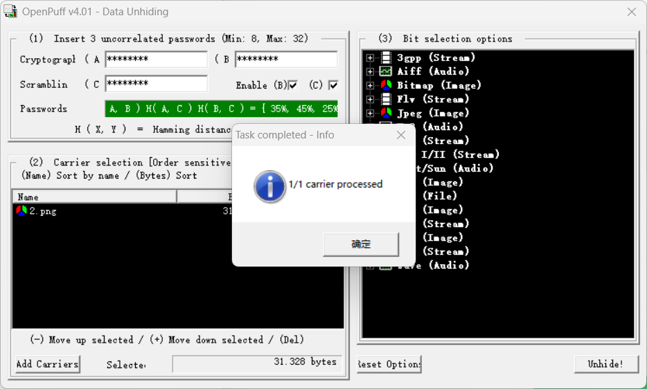 那么我们下载openpuff4.01,选择unhide,key填上面解密出的三个,选择这个图片,点击Unhide!即可