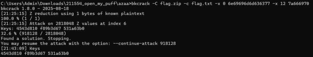 bkcrack -C flag.zip -c flag.txt -x 0 6e69696d6d636377 -x 12 7a666970