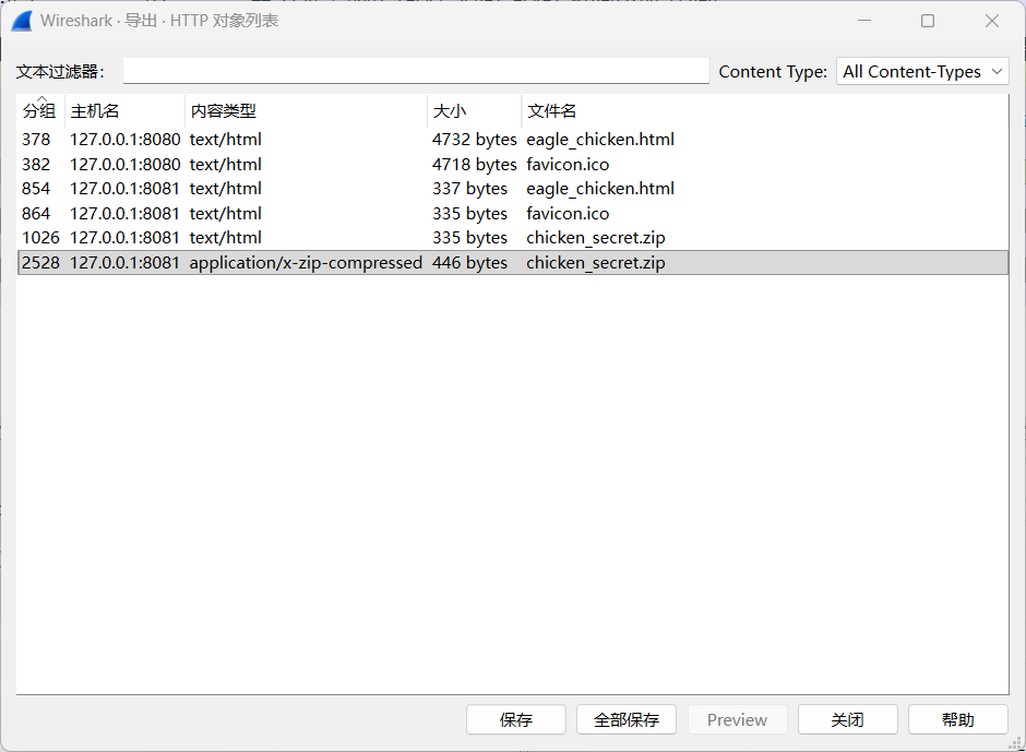 打开1.pcapng,过滤http流量,看到有个传入的chicken_secret.zip